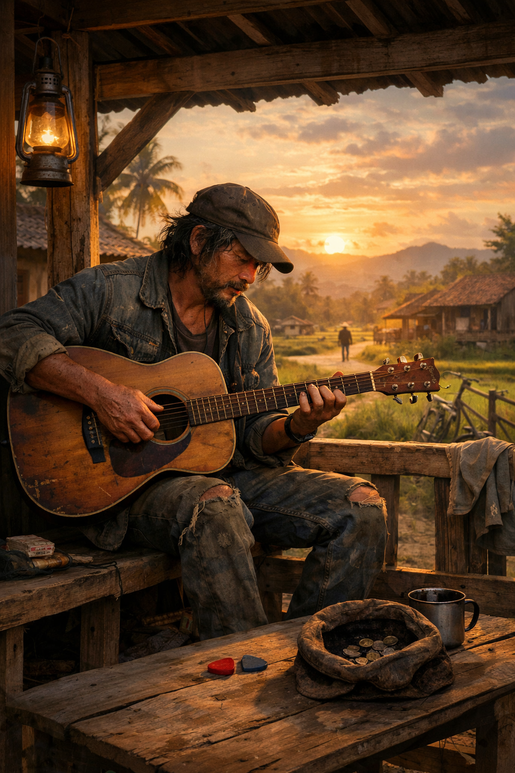 Dengan hati yang masih setengah di alam mimpi, aku membayangkan diriku berjalan menyusuri jalan setapak menuju warung kecil di ujung desa. Matahari mulai condong ke barat, debu tanah halus mengepul di bawah sandal jepitku. Warung itu sederhana, atapnya dari seng berkarat, rak-rak kayu penuh barang seadanya. Di balik meja, Pak Min, tukang warung yang sudah tua, menyambutku dengan senyum lesu.“Senar gitar, Pak?” tanyaku, suaraku masih agak serak karena baru bangun.Pak Min mengangguk pelan. Ia membungkuk, mengeluarkan beberapa plastik kecil dari laci bawah. “Ada yang ini, Mas. Satu set cuma dua puluh ribu. Bagus kok, cukup buat main santai.”Dua puluh ribu.Kata-kata itu terasa seperti tamparan ringan. Aku menatap plastik bening itu dengan kecewa yang mendalam.